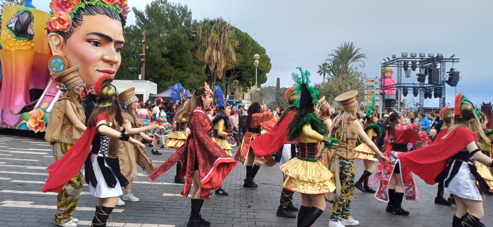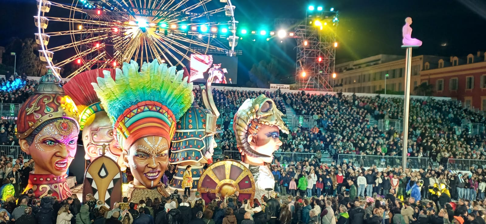 Les tribunes affichent complet de 20h30 à 22 heures, dès le samedi 14 février pour des places payantes en tribune mais gratuites si on arrive sur place avec un déguisement complet. Et l’on chante et on danse dans les tribunes, aux sons de tubes connus, on lance des confettis sur son voisin, on fait voler des ballons de couleurs d’une rangée à l’autre, une gaité partagée. « It’s fabulous » me dira une Écossaise désormais installée à Nice après un coup de cœur pour cette ville. « Les couleurs sont magiques » diront deux jeunes étudiants argentins qui se destinent à l’enseignement du français dans leur pays. Ils sont venus à Nice pour vivre une expérience carnavalesque française qu’il trouve bien différente du Carnaval en Argentine, notamment pour la programmation musicale en accompagnement des cortèges.