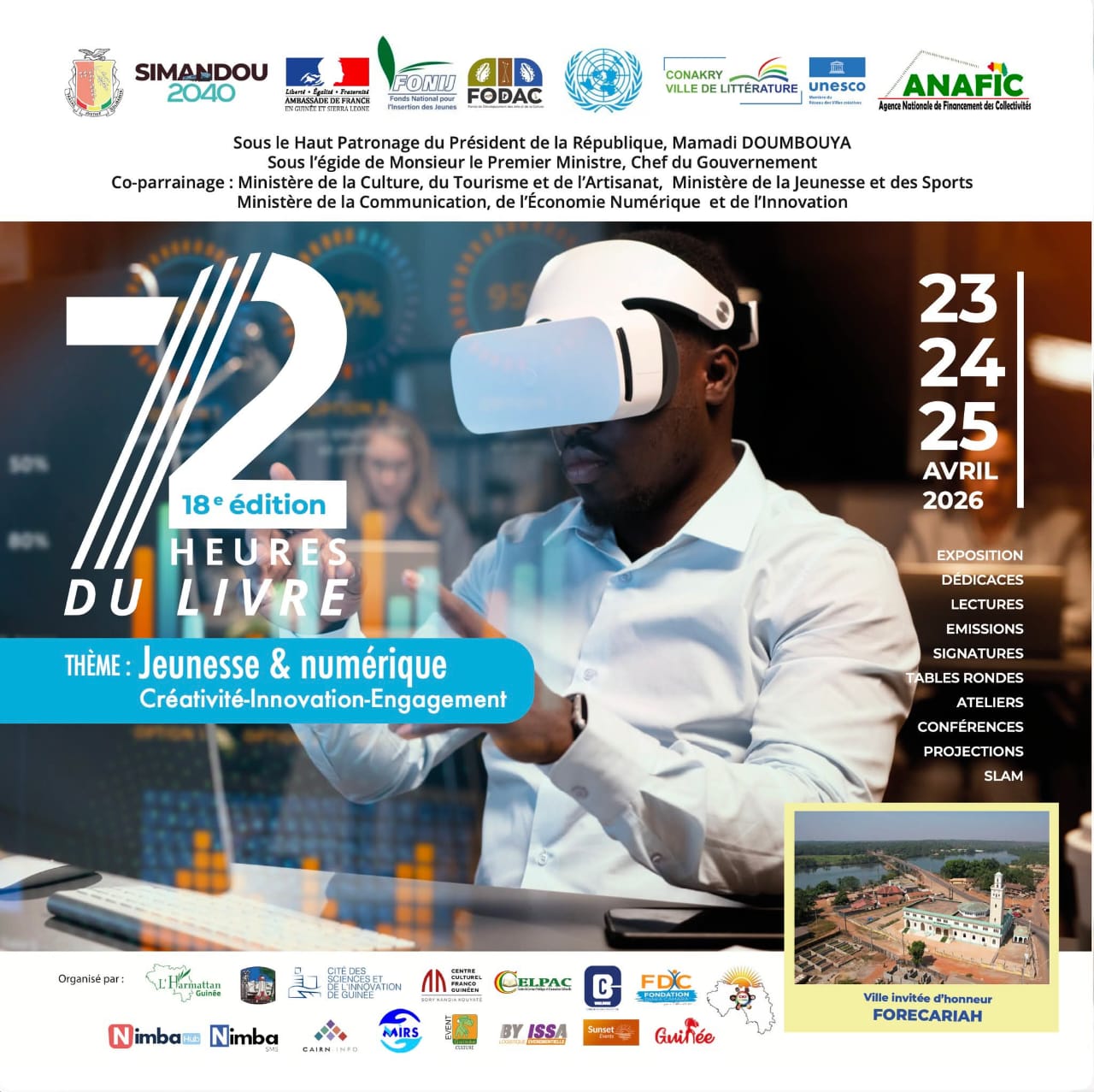 La Guinée célèbre le livre, la pensée et la créativité à travers un événement devenu incontournable dans le monde littéraire : les 72 Heures du Livre, organisées par L’Harmattan Guinée. Placée sous le thème « Jeunesse et numérique : créativité, innovation et engagement », cette édition se tiendra du 23 au 25 avril 2026 au lac Bassikolo, en face du Palais du Peuple.